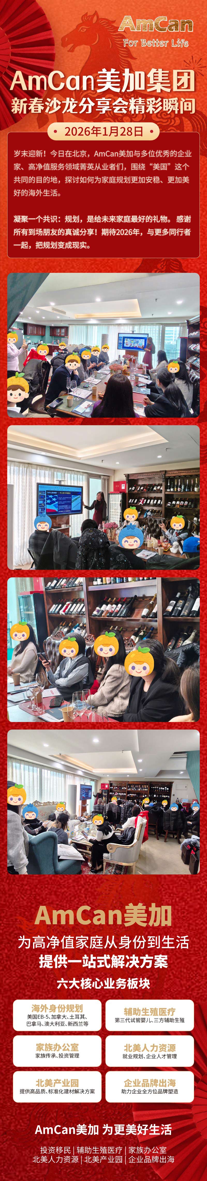 岁末迎新!今日在北京,Amcan美加与多位优秀的企业家、高净值服务领域菁英从业者们,围绕“美国”这个共同的目的地,探讨如何为家庭规划更加安稳、更加美好的海外生活。