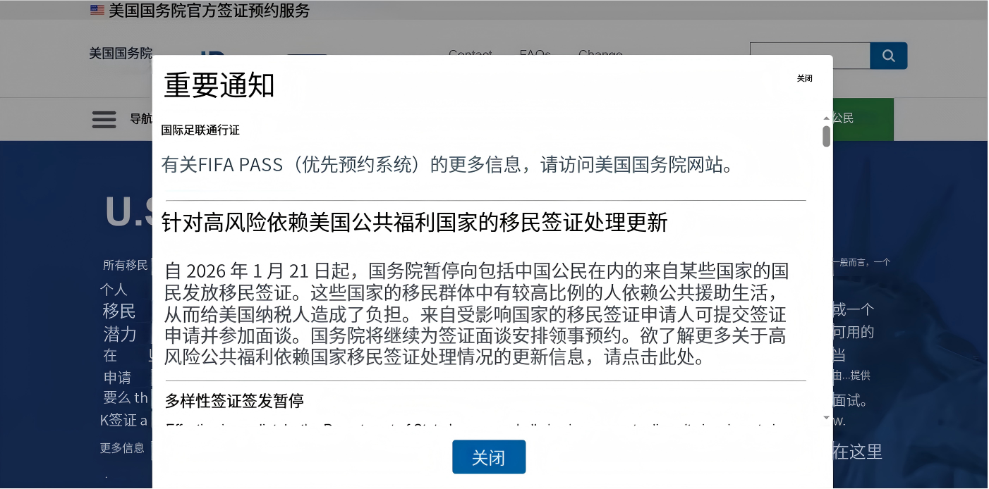 朋友圈突然被一张截图刷屏了——美国签证预约官网(USTravelDocs)弹窗提示:“自2026年1月21日起,暂停向包括中国在内的某些国家国民签发移民签证”!