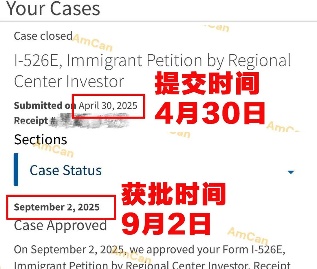 W女士一家委托AmCan美加集团,在2025年4月30日正式向美国移民局提交I-526E申请。