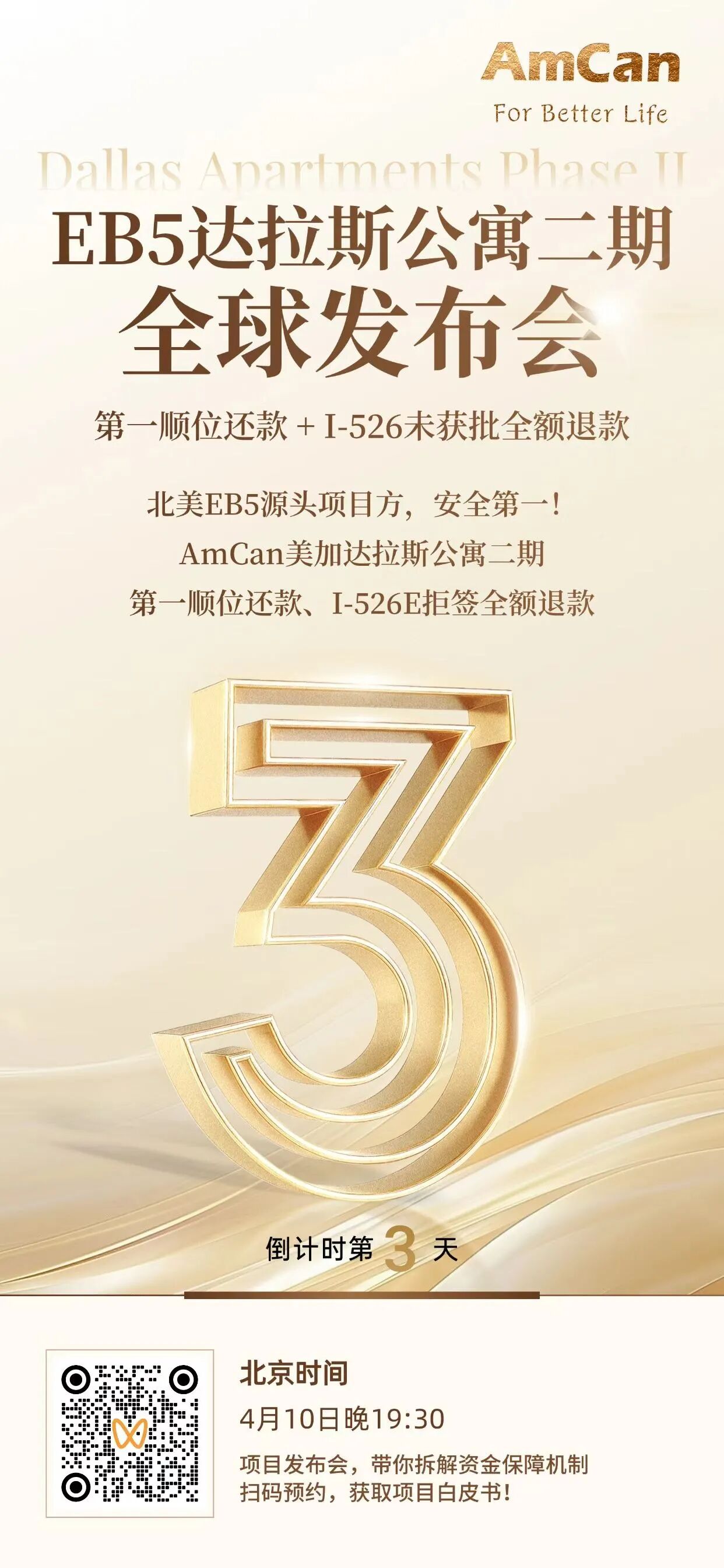 想要在政策变动前锁定优质项目?AmCan美加集团的自有乡村EB-5项目——达拉斯公寓二期项目全球发布会将于4月10日举行。作为该项目的源头项目方,AmCan美加集团直接掌控项目进度,确保项目安全有保证。该项目为A类稳健投资项目,具备无排期、第一顺位还款、I-526E拒签全额退款等核心优势,是目前市面上极具竞争力的稳健选择。该项目名额紧缺,全球仅52席名额,先到先得。